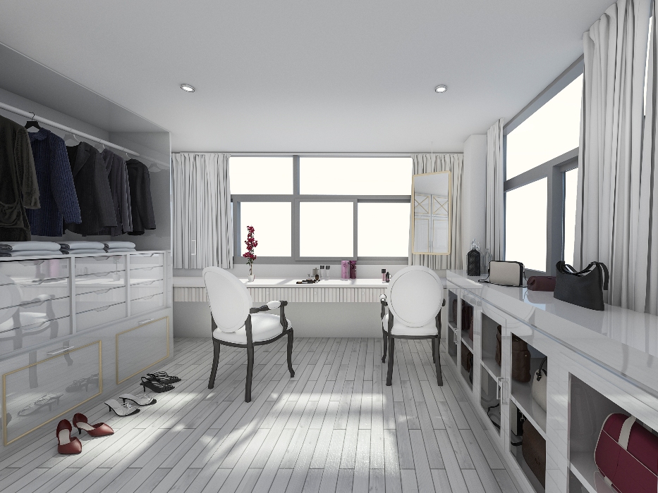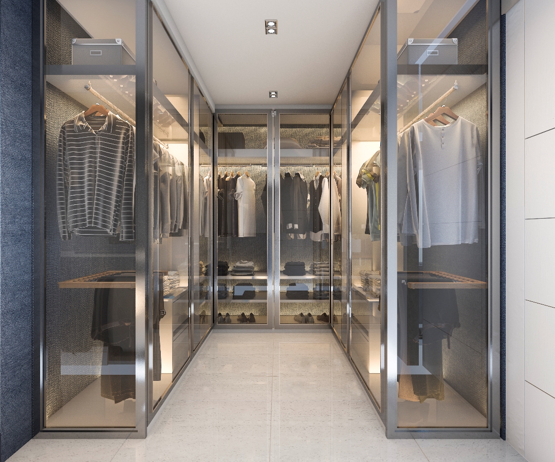 في حال وجود إنارة مخفيّة في الغرفة، تصمّم ظهور الخزائن بالزجاج حتّى يخترقها الضوء، وينعكس على محتويات الخزائن. من جهة ثانية، يمكن أن تكون الخزانة ملبسة بالزجاج، ومدعمة بقضبان من الـ"ستاينلس ستيل" حتّى تعلق فيها الملابس، ومثبتة إلى يمينها ويسارها رفوف من الزجاج للأحذية وللإكسسوارات.