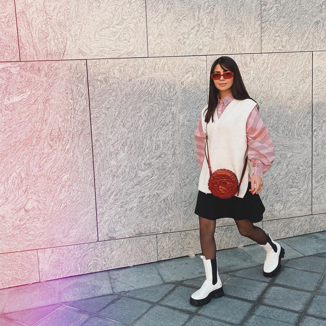5- نسقت ديما الجيليه أي السترة الخالية من الأكمام البيضاء مع قميص مربع التقطيعات منفوخ الأكمام وتنورة قصيرة سوداء وانتعلت حذاء أبيض ووضعت نظارات مستديرة وردية كبيرة. هو لوك عصري يصلح للشابات ويليق بكل أشكال الجسم.