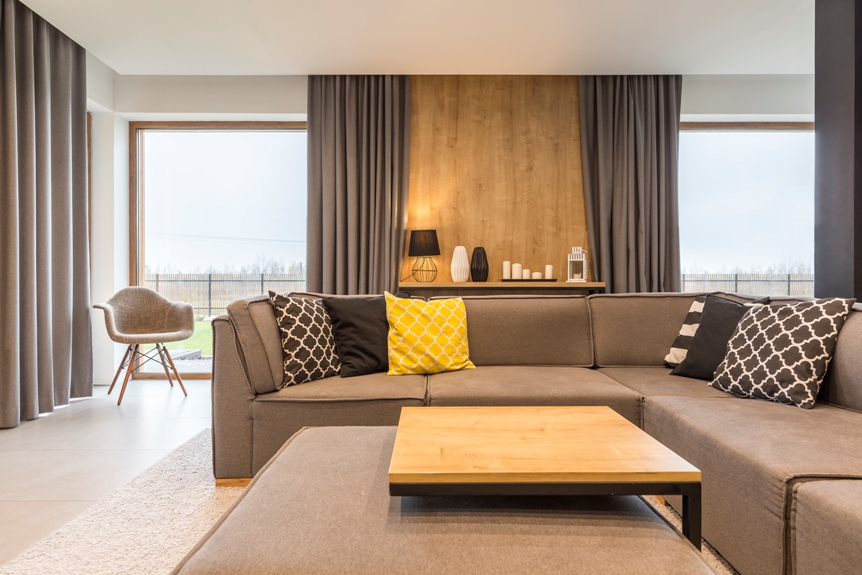 في المنزل المودرن، يمكن انتقاء كل وسادة بلون، إذا كانت الأريكة رمادية، مع التنسيق مع الستائر أو السجادة أو المقعد المنفرد.