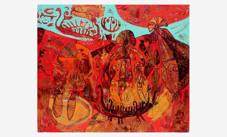 شكلت لوحات معرض «سيرة بدائية» متنفّساً جمالياً اعتمدته الفنانة للتغلب على حالات القلق والخوف التي انتابتها خلال فترة الحجر الصحي، بسبب جائحة كورونا. من ثمَّ بدت لوحاتها تشخيصية ورمزية، تحيل على عوالم أسطورية تشكلها مخلوقات غرائبية، وكائنات طوطمية ونباتات برِّية بدائية تحتشد بجانب تكوينات هندسية وأشكال عضوية موشاة بعلامات ورموز، مستوحاة من حضارات إنسانية قديمة.