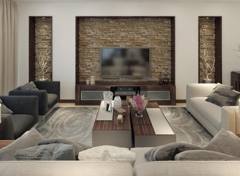يمكن إكساء الجدار الداخلي بالحجر الذي يشبه ذلك الخارجي، وإنما باستخدام قطع أصغر منه. ويرغب البعض في حضور الحجر المنقوش، الذي يدمج بالخشب النافر، عند إعداد وحدة التلفزيون، مع توظيف الإضاءة. وتثبت في الوسط شاشة التلفاز (أو مرآة ضخمة أو لوحة فنية).